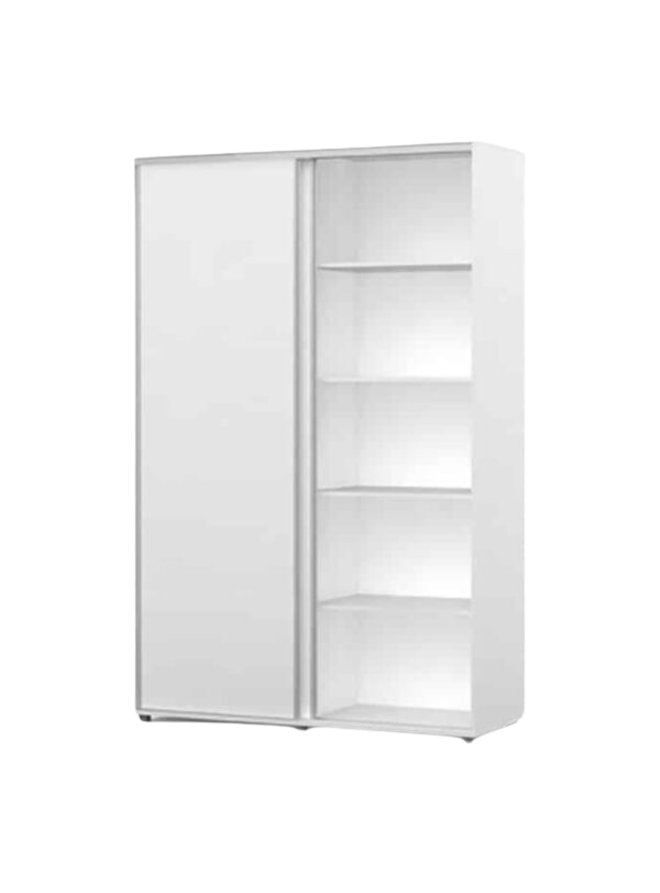 ארון הזזה 2 דלתות לבן יפהפה המעוצב בסגנון מודרני מינימליסטי, הוא הרהיט המושלם לאחסון בגדים בחדרי השינה. הארון מכיל מדפים, מגירות ותאי אחסון ושתי דלתות הזזה לתפעול מיטבי. רגליות המתכת של הארון שומרות עליו ועל הבגדים המאוחסנים בו ומקלות את עבודת הניקיון סביבו. ארון בגדים לבן ומקסים יעשיר את חדר השינה שלכם ויוסיף לו יופי ותכלית.